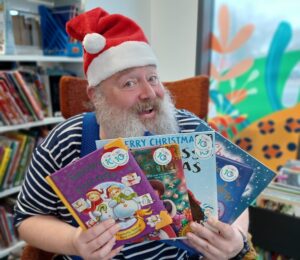Father Christmas with books cropped for JG appeal